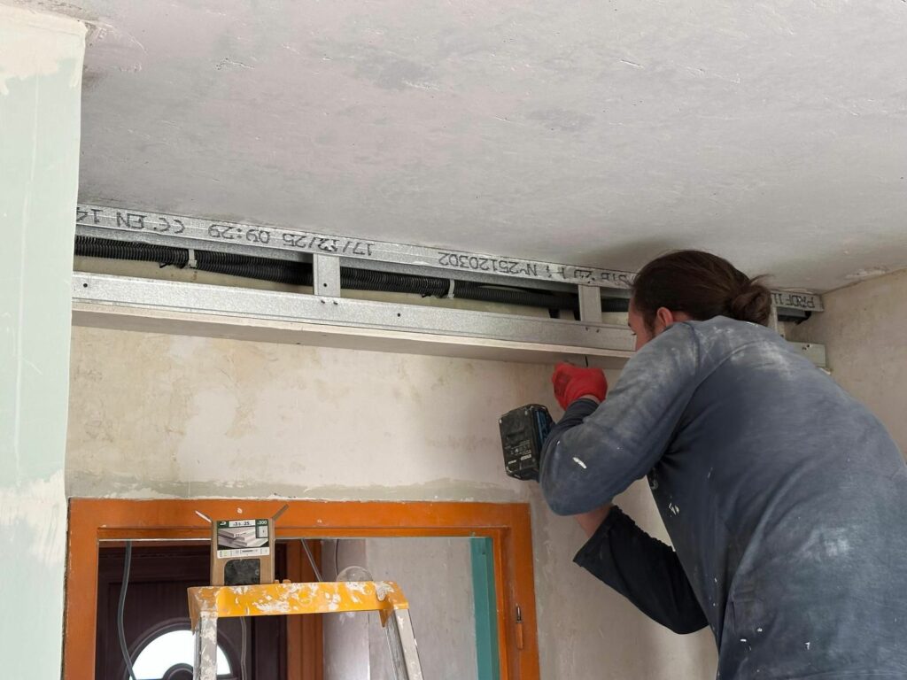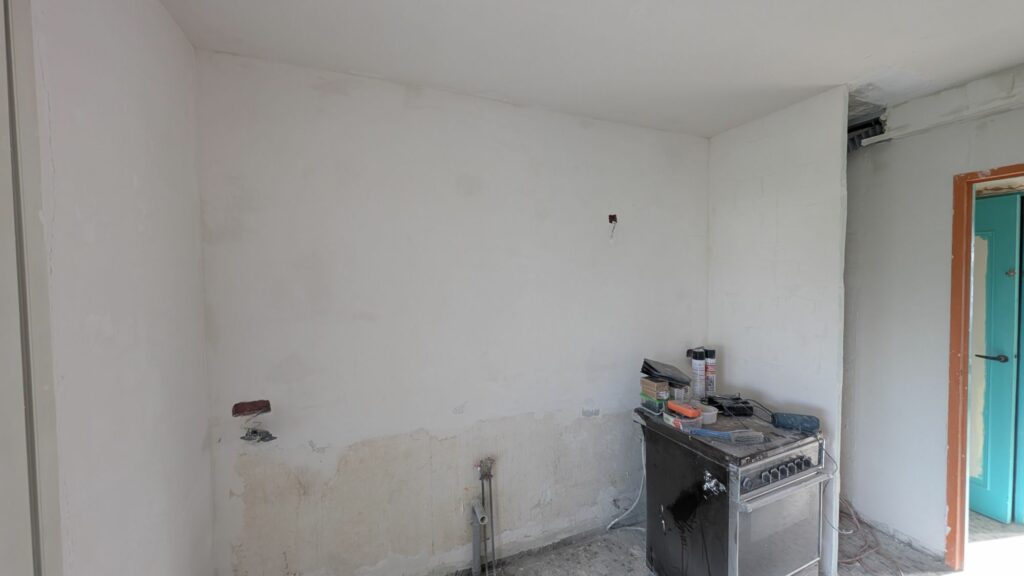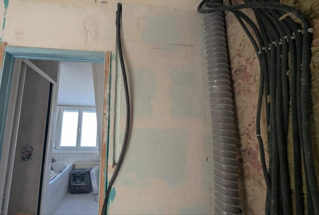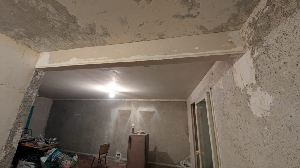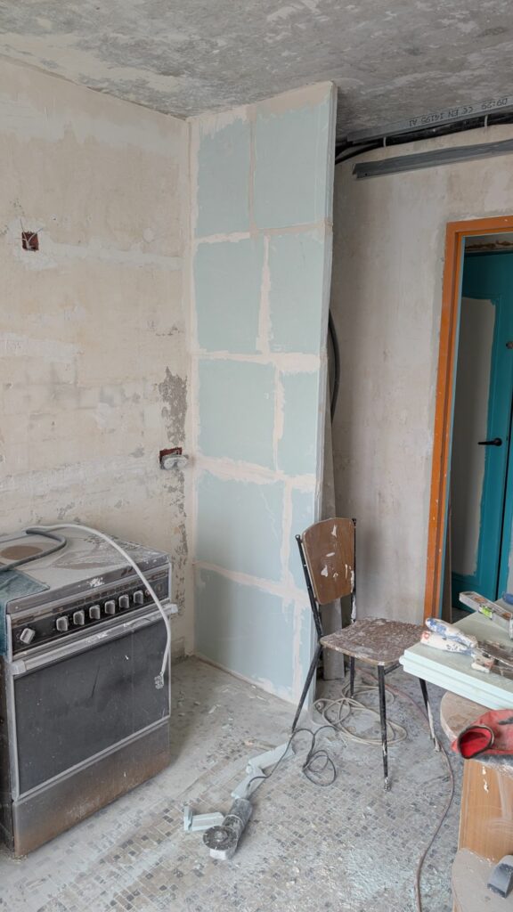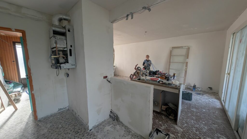 Pour rattraper les angles complètement défoncés, j’ai préféré poser une lame de placo sur le dessous et sur la partie cuisine de la poutre. Ça me permet de repartir sur une base saine et d’avoir quelque chose de bien plus propre. La partie salon a été réparée avec du map afin d’avoir une surface lisse pour accueillir les enduits. Pour le dessous par contre, j’ai eu l’idée d’ajouter un bandeau COB pour l’éclairage du plan de travail, et pour habiller un peu cette protubérance du plafond. Les profilés que j’ai commandés n’étaient pas compatibles entre eux, j’attends donc de recevoir le nouveau modèle pour terminer ça. L’arrivée électrique n’était par contre pas de tout repos, car je devais passer dans le mur de béton avec un angle presque à 90° pour récupérer le courant depuis le fond des toilettes.