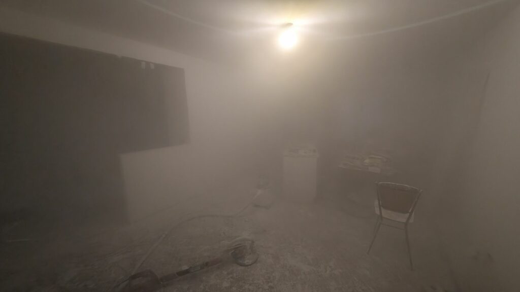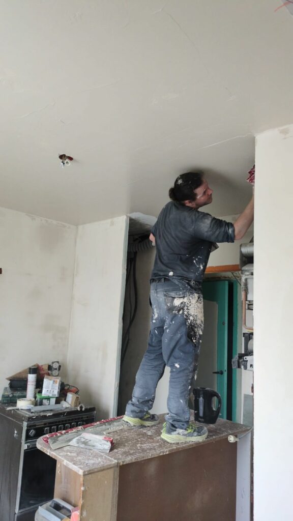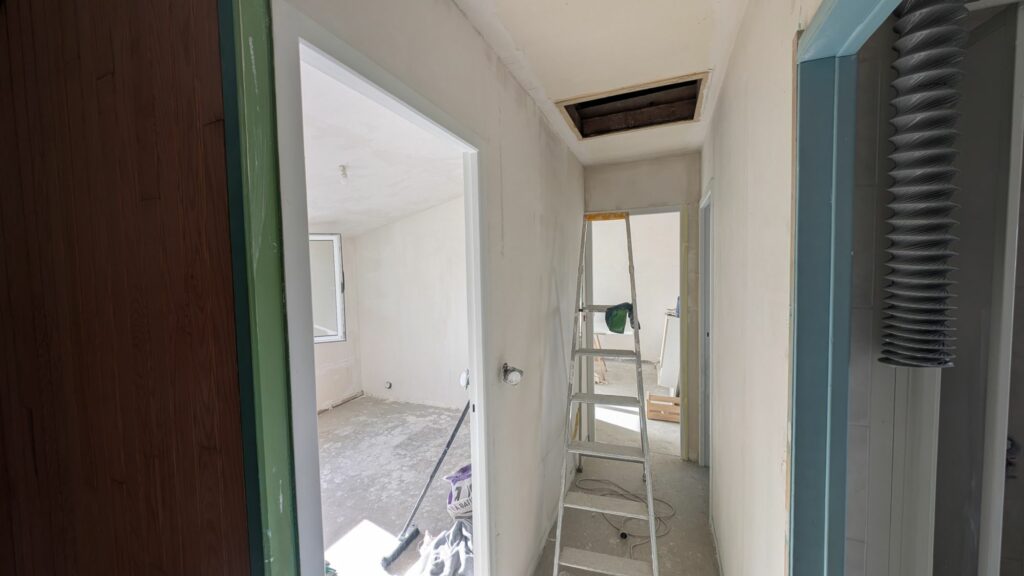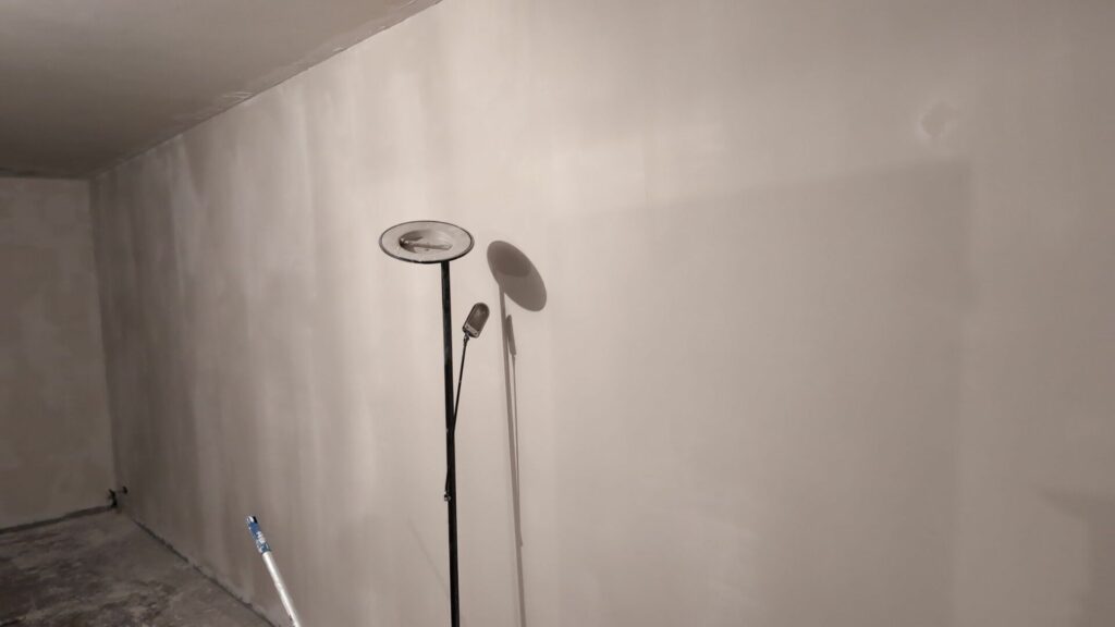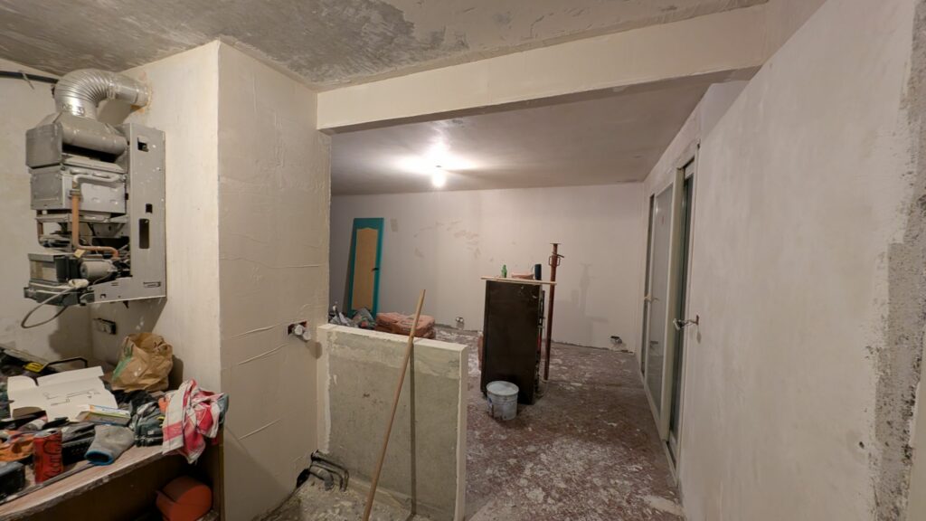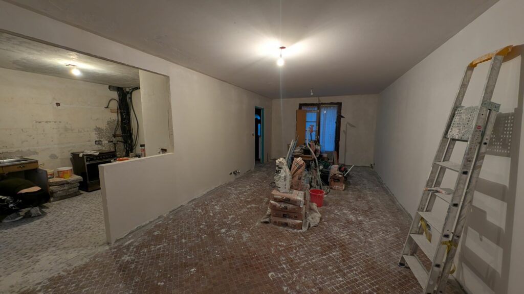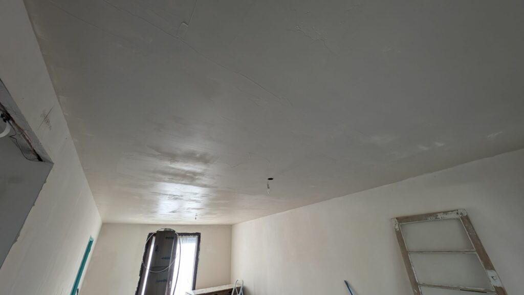 Pour les murs et plafonds du salon et de la cuisine, il ne reste que la couche de finition avant de pouvoir commencer les peintures. La pose des sols arrivera bien plus tard, mais on commence à voir le bout de ces deux grandes pièces. Bien évidemment, vous commencez à me connaitre, tous ces enduits m’ont donné une tendinite au poignet droit. À chaque projet que je réalise ses blessures !