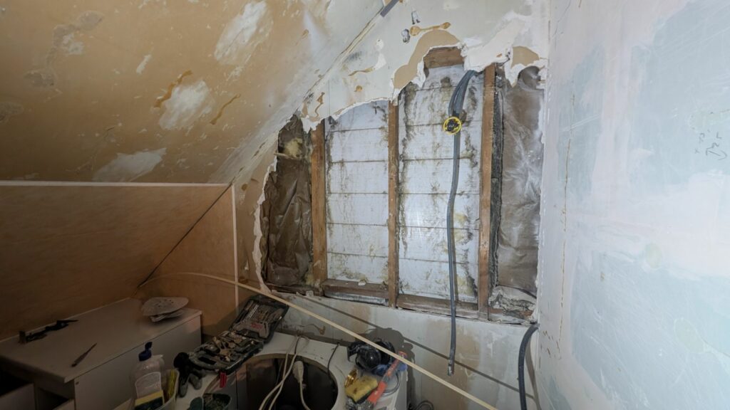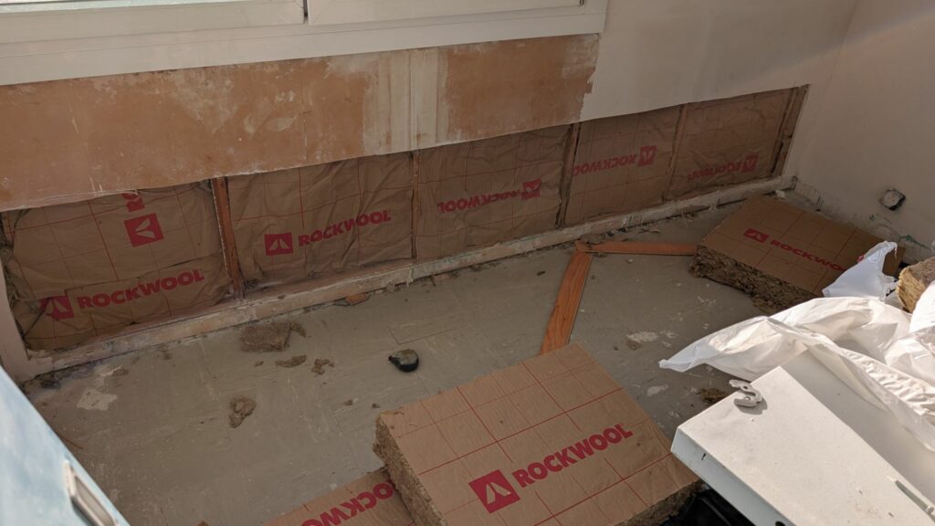 Alors que je faisais une saignée dans la salle de bain pour y mettre trois prises électriques, je me suis rendu compte que l’isolation de ce mur était catastrophique. Même pas 3cm de laine de verre disparate et en très mauvais état isolait ce mur du lambris en PVC qui donne directement dehors, sur le pignon. Il était hors de question de laisser ça comme ça, surtout pour une pièce dans laquelle le moindre degré de moins se fait ressentir. J’ai donc ouvert une grosse partie de ce mur, alors que je ne voulais pas trop toucher à la salle de bain tant que je ne m’étais pas installé dans la maison.