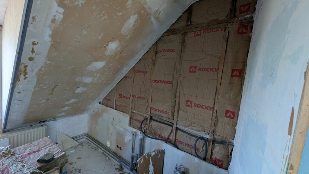 Comme vu au début du chantier, les combles perdus sous rampants (en dessous des fenêtres de l’étage) était inexistant. J’avais procédé à l’ouverture dans toutes les pièces de l’étage à l’exception de la salle de bain, car je souhaiterais m’atteler à cette pièce plus tard. Il me fallait maintenant isoler tout ça pour refermer les murs et passer aux enduits.