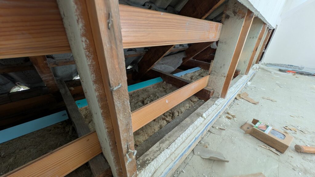 J’ai commencé par isoler la dalle à l’intérieur des rampants. En effet, les pièces du bas débordent d’un bon 45cm dans les rampants. Ne pas isoler la dalle, c’était s’exposer à de gros pont thermique sur tous les plafonds de façade au RDC. J’ai utilisé des panneaux de laine de roche, que j’ai maintenu au sol avec des morceaux de bois de récupération. C’était fastidieux, car je devais visser en diagonal pour bien maintenir ces accroches, mais le rendu n’est pas trop mal.