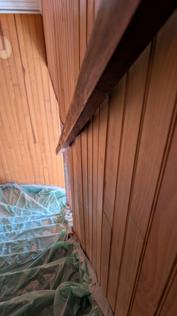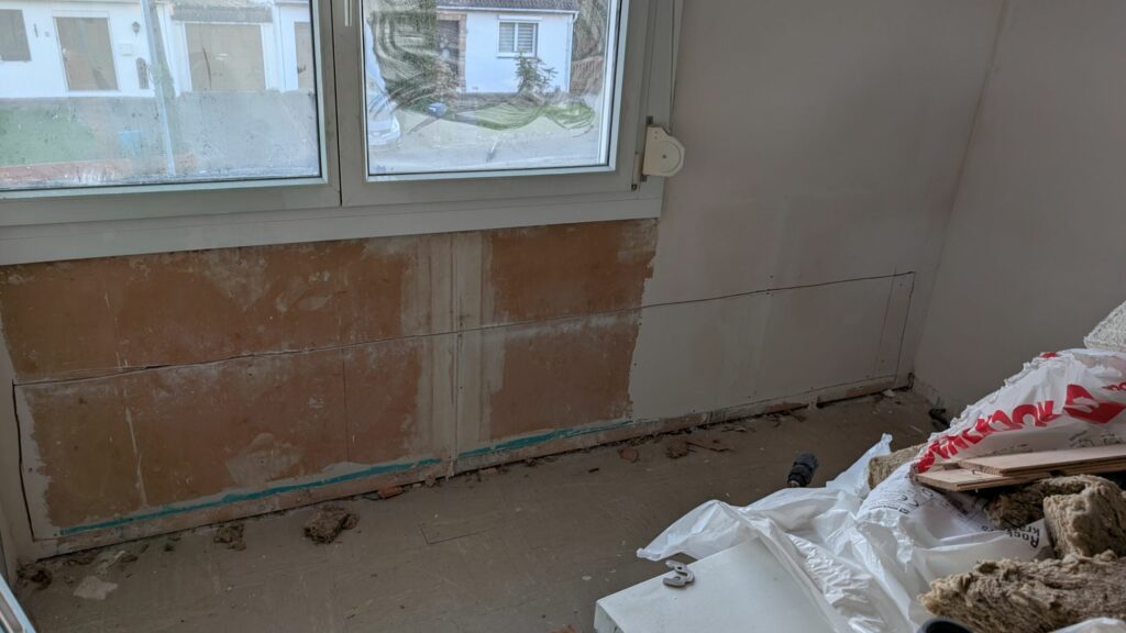 Au final, plus de peur que de dégâts, mais il y aura clairement du travail en plus pour retirer le lambris et refaire le mur derrière. Je n’aimais pas ce lambris, mais je ne prévoyais pas vraiment de le changer; ce sera quelque chose que je ferai plus tard. Ma mère a réussi à ravoir la porte, avec beaucoup de ponçage et quelques couches de peinture. Si je n’étais pas repassé sur le chantier le lendemain, ça aurait pu être catastrophique.