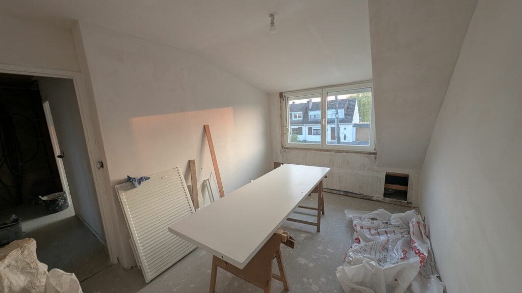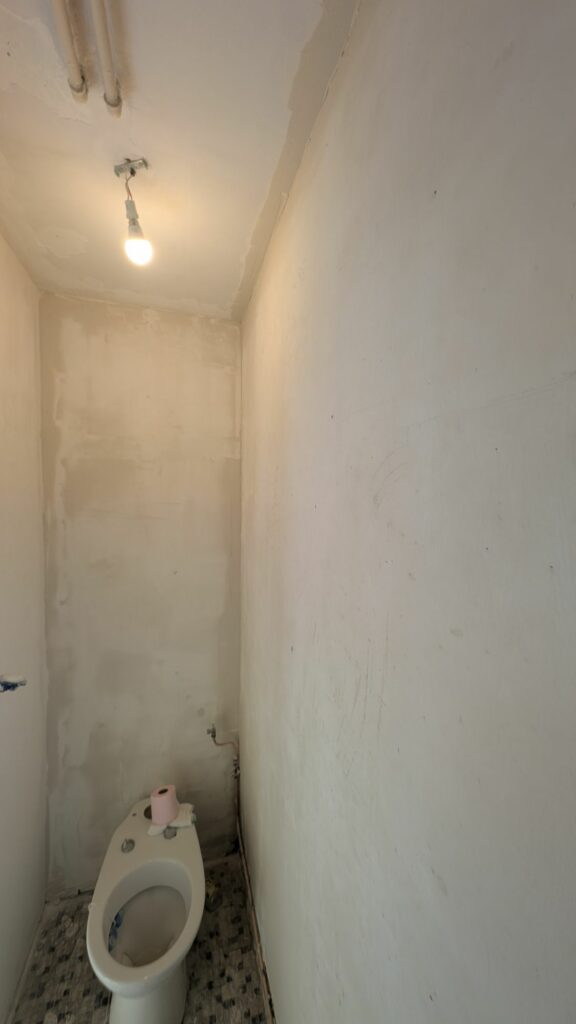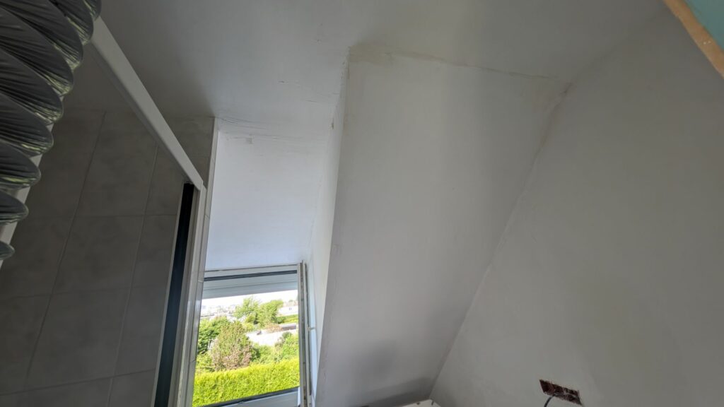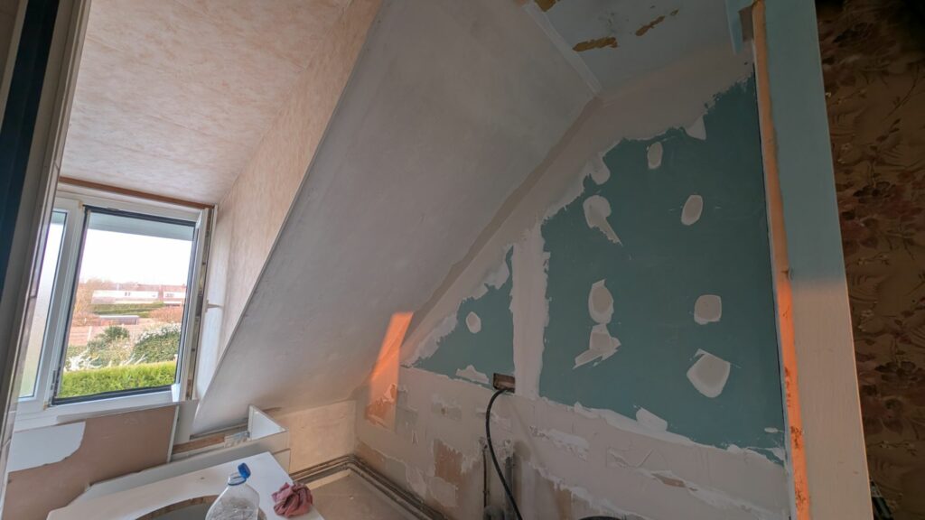 On avait commencé les enduits dans la première chambre et dans le bureau. Accrochez-vous, ça a bien changé ! Un travail déjà colossal a été réalisé depuis le dernier article. Tous les murs et plafonds de la première chambre ont eu leurs deux couches d’enduit garnissant, avec leur ponçage et dépoussiérage respectifs. À l’exception des murs de façade car j’attends de changer les fenêtres. De même pour le bureau. S’en est suivi la salle de bain avec quelques imprévus; la colle qui tenait les lames de PVC, bien que poncée, grattée et peinte, a fait cloquer la première passe. Il a fallu tout gratter et repeindre avec de la glycéro pour complètement figer les résidus. Seul le dessous de la mansarde n’a pas encore eu d’enduit, car je dois vérifier une petite fuite au niveau du toit.