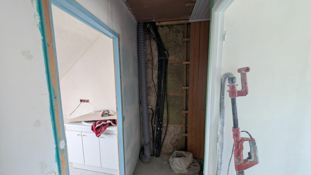 Je redoutais un peu la pose de la VMC. Non pas que ce soit compliqué en soit, mais parce que je devais faire face à plusieurs problématiques. La première, c’était de faire un coffrage minimaliste dans la cuisine afin de ramener la gaine de la VMC jusqu’aux toilettes. Je ne voulais pas d’un gros coffrage difforme, donc j’ai taillé mes rails pour réduire leur taille, mais passer la gaine dans un espace aussi restreint sans l’abîmer n’était pas aisé. Il fallait en plus la faire traverser la dalle béton par les deux trous que l’on avait carottés à l’étage, sans l’abimer, à nouveau. Avec minutie, patience et beaucoup de préparation à base de scotch pour recouvrir tout ce qui pouvait les abimer, j’ai réussi à m’en sortir.