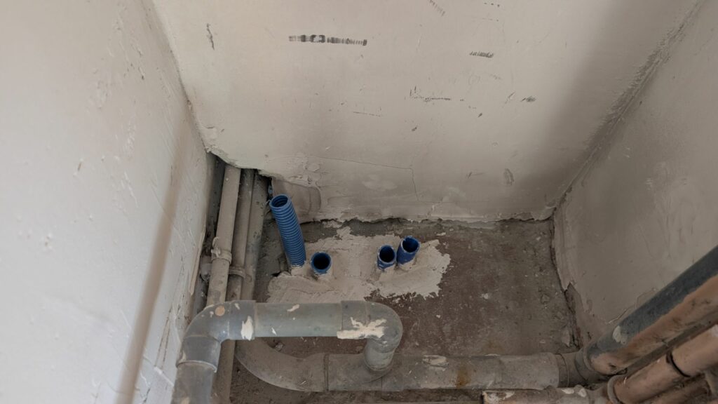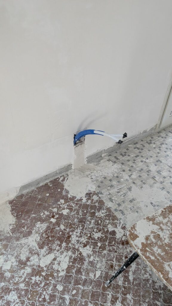 J’ai dû faire le même passage dans la dalle pour la gaine de la cuisine, un peu plus grosse que celle des toilettes. Il m’a fallu ouvrir un peu plus les trous dans la dalle, mais c’est finalement passé sans trop de difficultés.