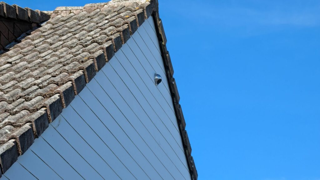 L’étape suivante, c’était d’installer la bouche de sortie extérieure de cette VMC. Comme le bloc central allait se trouver dans les combles, mais que le toit ne possède pas de tuile permettant une évacuation de l’air, il fallait faire sortir l’air en façade. La seule façade disponible depuis les combles, c’est le pignon au-dessus du garage. Je pensais au début que c’était un mur plein, en parpaing, mais non, c’est juste un lambris en PVC qui sert de façade. Je suis monté sur le toit du garage, et j’ai installé une échelle, inclinée à cause du garage. Bien évidemment, c’est à ce moment-là que la météo s’est gâtée; petites pluies et bourrasques. L’échelle est tombée à deux reprises lorsque je n’étais pas dessus, et la troisième fois, en essayant de la retenir, je me suis planté le cutter dans un doigt. Un peu de sang, mais rien de grave, on a continué l’opération !