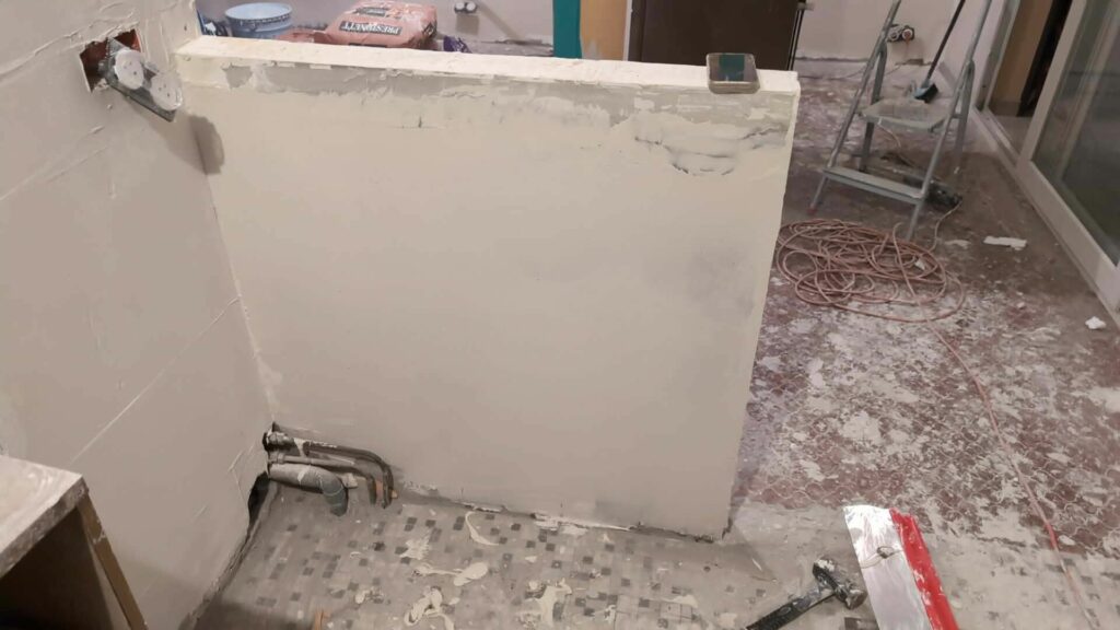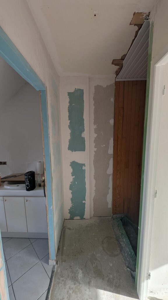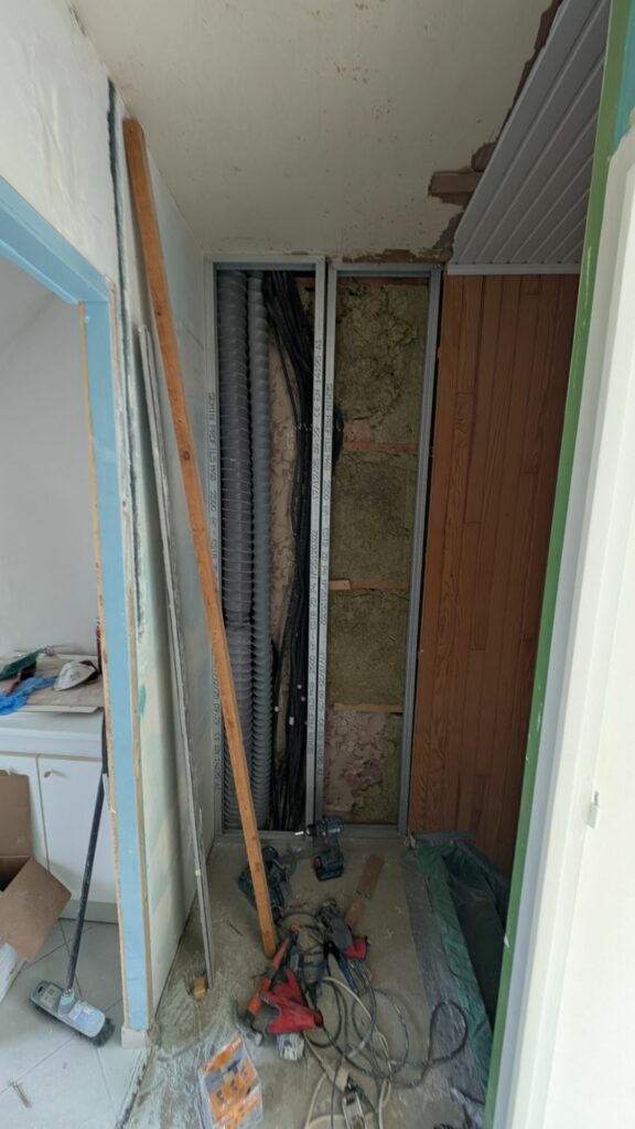 À chaque jour de travail son bloc de posé ! En faisant bien attention de renforcer le tout avec des fers, dans le mur, dans le sol et dans le plafond, j’ai monté cette petite cloison. Elle encapsule aussi toute la partie électricité, et permettra de cacher les gaines de VMC qui sortent du coin de la pièce. Les murs n’étant pas droits, je n’ai pas réussi à faire un mur avec un bel angle à 90°, mais c’est quelque chose que je rattraperai avec de l’enduit plus tard.