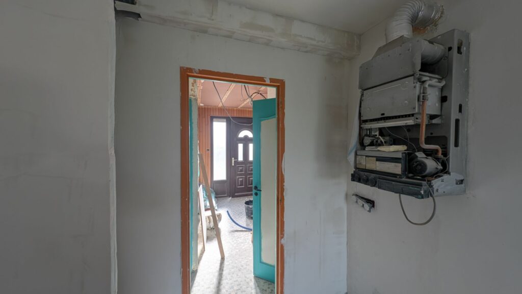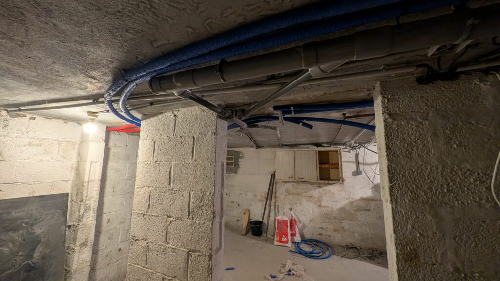 Trois heures pour percer la dalle afin d’y passer quatre gaines pour les tuyaux multicouches. Un des fers du béton armé nous a clairement cassé les pieds. Et le marteau perfo qui a décidé de faire des siennes avec un faux-contact n’a pas arrangé les choses. Une petite réparation sur le chantier et on était de nouveaux en train de castagner ce fer jusqu’à-ce qu’il ne cède. Sitôt percé que c’était déjà rebouché avec les quatre morceaux de gaine. De là, j’ai commencé à tirer mes tuyaux de multicouche en diamètre 20 pour faire la boucle principale. Je les ai maintenus au plafond avec des chevilles et des colliers de serrage. Le rendu est plutôt propre, mais pas terminé; il va maintenant me falloir sertir tous les raccords et les dérivations vers les trois radiateurs. En parlant des radiateurs, j’ai gardé celui de l’entrée, sur lequel je devrais juste me raccorder au cuivre, mais j’ai décidé de remplacer le grand radiateur du salon et le petit de la cuisine avec deux gros radiateurs verticaux de 1755w; l’un à moitié entre la cuisine et la salle à manger, sous la poutre, et l’autre dans un coin du salon.
